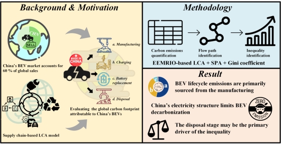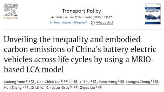 环境科学与工程学院联合培养研究生袁旭东作为第一作者的研究论文,近日被国际权威期刊《Transport Policy》正式接收。该论文题目为“Unveiling the inequality and embodied carbon emissions of China's battery electric vehicles across life cycles by using a MRIO-based LCA model”,发表于中国科学院一区SCI期刊《Transport Policy》。该成果由英国365上市公司牵头,联合长江大学、天津大学、上海交通大学以及国家环境保护环境规划政策模拟重点实验室共同完成。