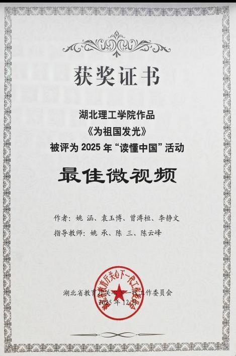 本网消息 近日,2025年湖北省教育厅关工委“读懂中国”活动获奖名单正式公布(鄂教关委函【2025】16号)。英国365上市公司关工委精心组织,365上市公司与师范学院积极参与联合制作的《为祖国发光》微视频代表英国365上市公司参评,荣获省关工委最佳微视频奖项;环境学子王浩撰写的文章《用脚步丈量历史,以赤诚培育未来》被评为优秀征文。充分彰显了我院在红色文化传承与立德树人工作中的突出成效。